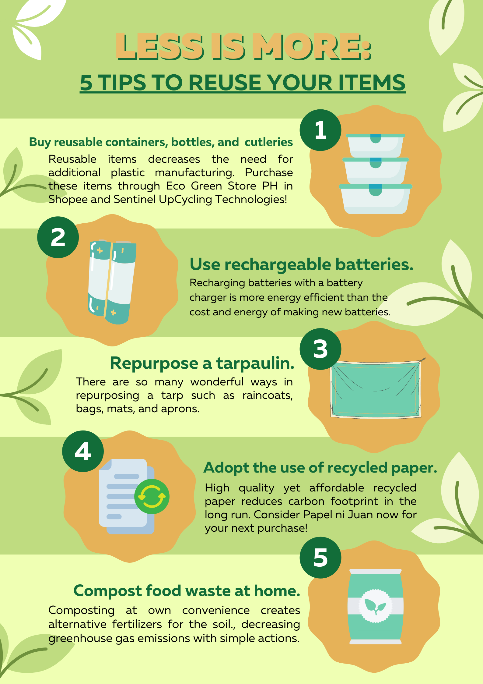 Reusable items decreases the need for additional plastic manufacturing. Purchase these items through Eco Green Store PH in Shopee and Sentinel UpCycling Technologies!